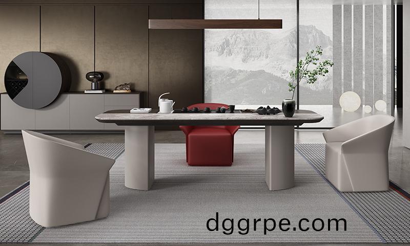 茶台桌面采用粉色设计,实木与大理石的拼接,半弧形的下角,内置隐藏式下水与上水装置。