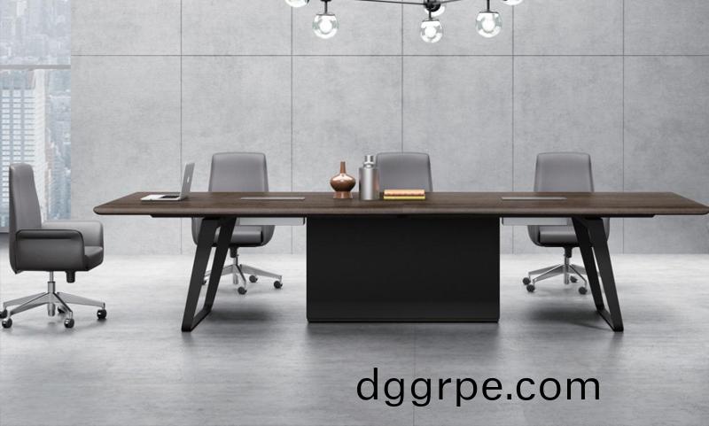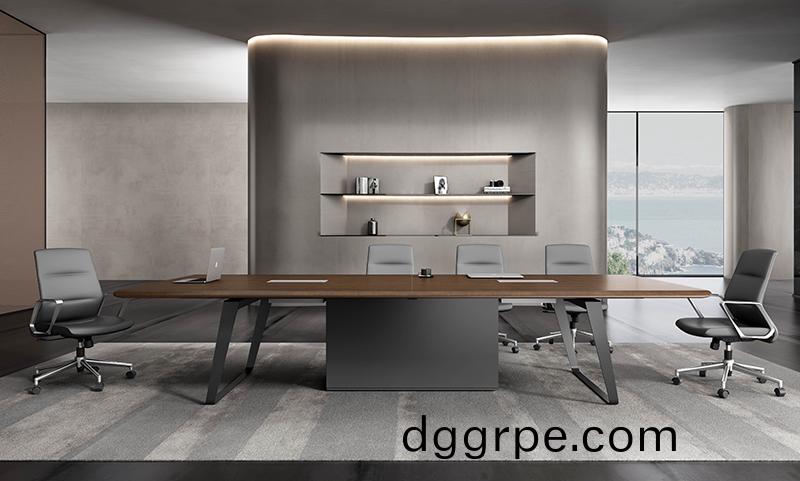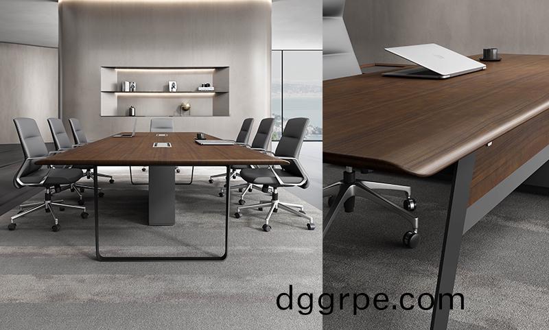曲智系列会议桌延续无边框圆弧设计,打造配套系列产品,外八字支撑钢脚架,美观牢固。天然纹核桃木油漆饰面。