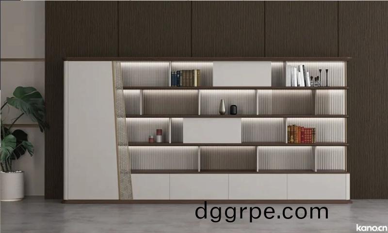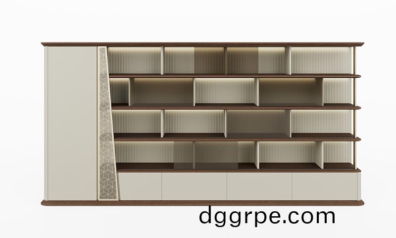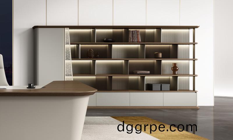 高管桌、会议桌均搭配香槟金装饰脚 ,高管柜搭配香槟金装饰板 ; 高管柜搭配茶色亚克力移门及深卡其波浪背板 。