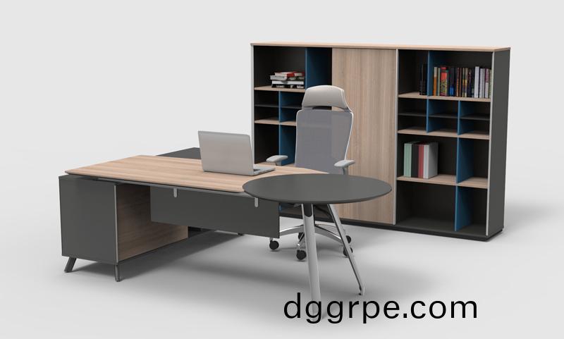 1.诺威系列主管办公桌台面采用不规则造型,多切割的直纹原木核桃木(表面拉丝)防火板台面搭配流星灰防火板圆盘,打造个性现代的风格。